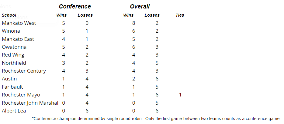 BASEBALL: Ten teams have accumulated at least 3 points in the Big Nine Conference standings and nine have posted between 2-6 points…Albert Lea, which sits in 10th place with 2 points, has defeated Winona and Northfield, both of which have 6 points…Mankato East stands alone in first place with 12 points, its only setback coming against Rochester Mayo…After starting the season 0-7, John Marshall as won back-to-back games against Red Wing (3 points) and Century (3 points)