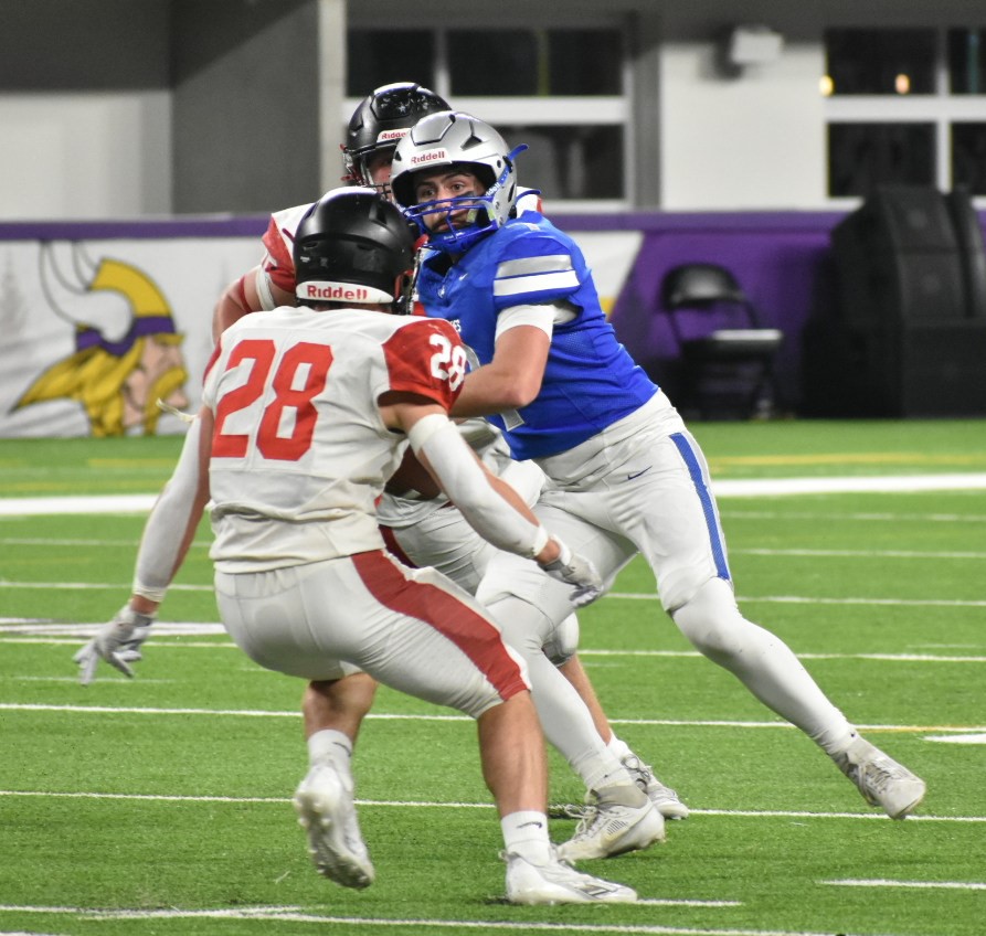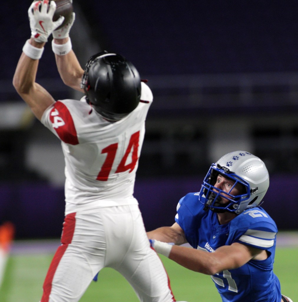 Ginskey — who is a Mr. Football finalist and All-Star game invitee — finished with a team-high nine grabs, 140 receiving yards and one touchdown. His 85 receptions and 1,319 yards on the season are both Owatonna records and unofficially tops in the entire state in both categories. His 10 interceptions are also No. 1 amongst all six MSHSL 11-man levels (Class A-Class AAAAAA).
