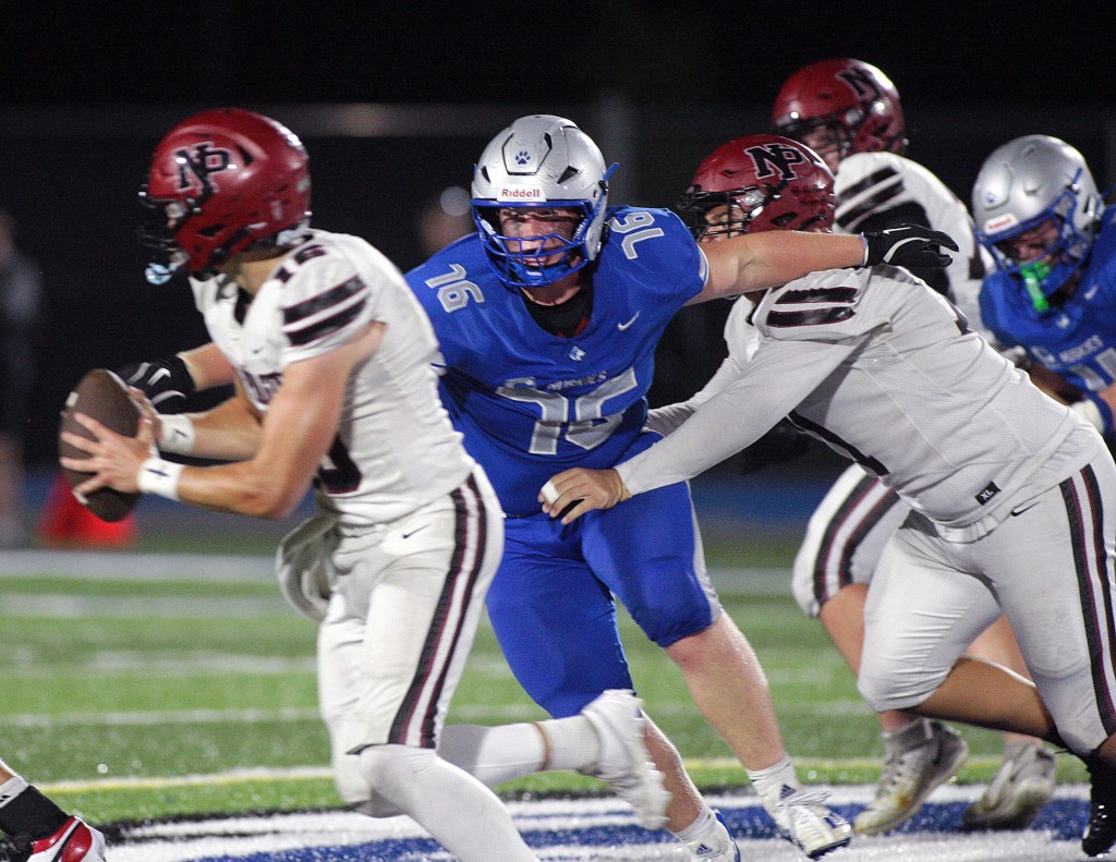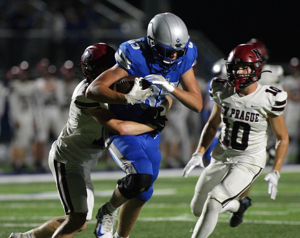 A little more than three minutes after booming punt to pin New Prague deep in its own territory during a critical junction late in a tie game, Sturges squinted through the drizzle, approached the snap and swung his leg through the ball, blasting a kick that split the uprights down the middle and landed more than 50 yards from where it started as time expired on the fourth quarter clock. The 37-yard field goal lifted Owatonna to a heart-pounding 17-14 victory over New Prague on Friday night in Northstar District South-Maroon action at Federated Field.