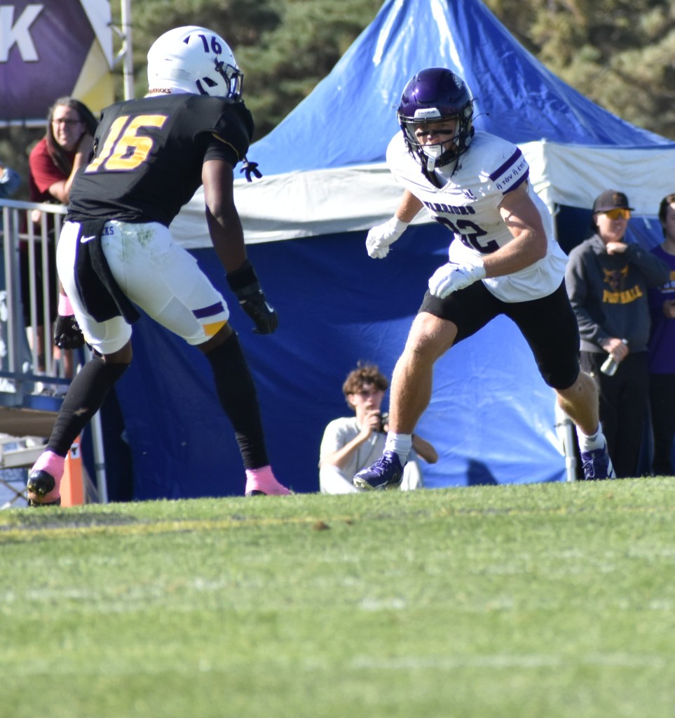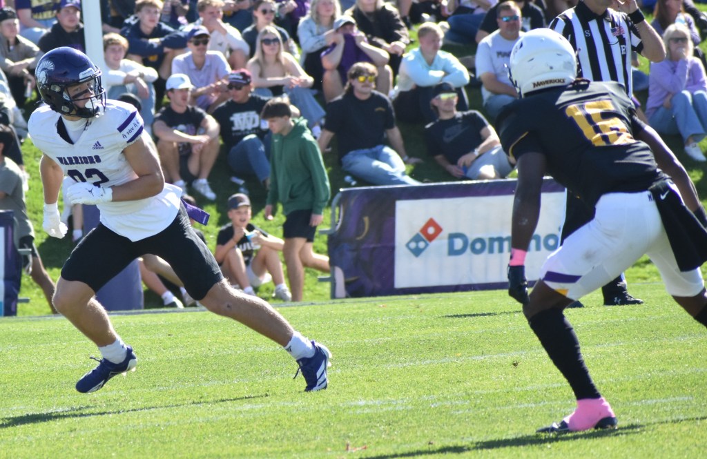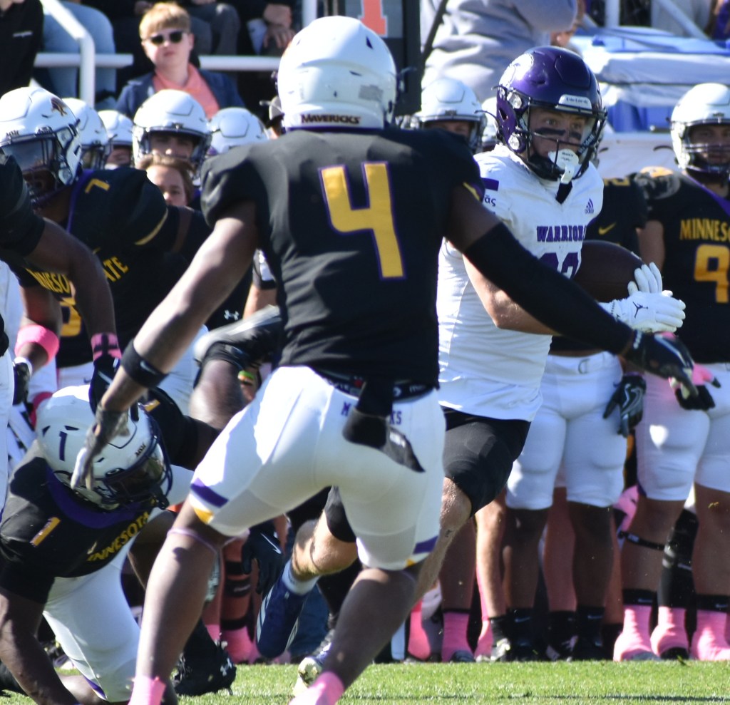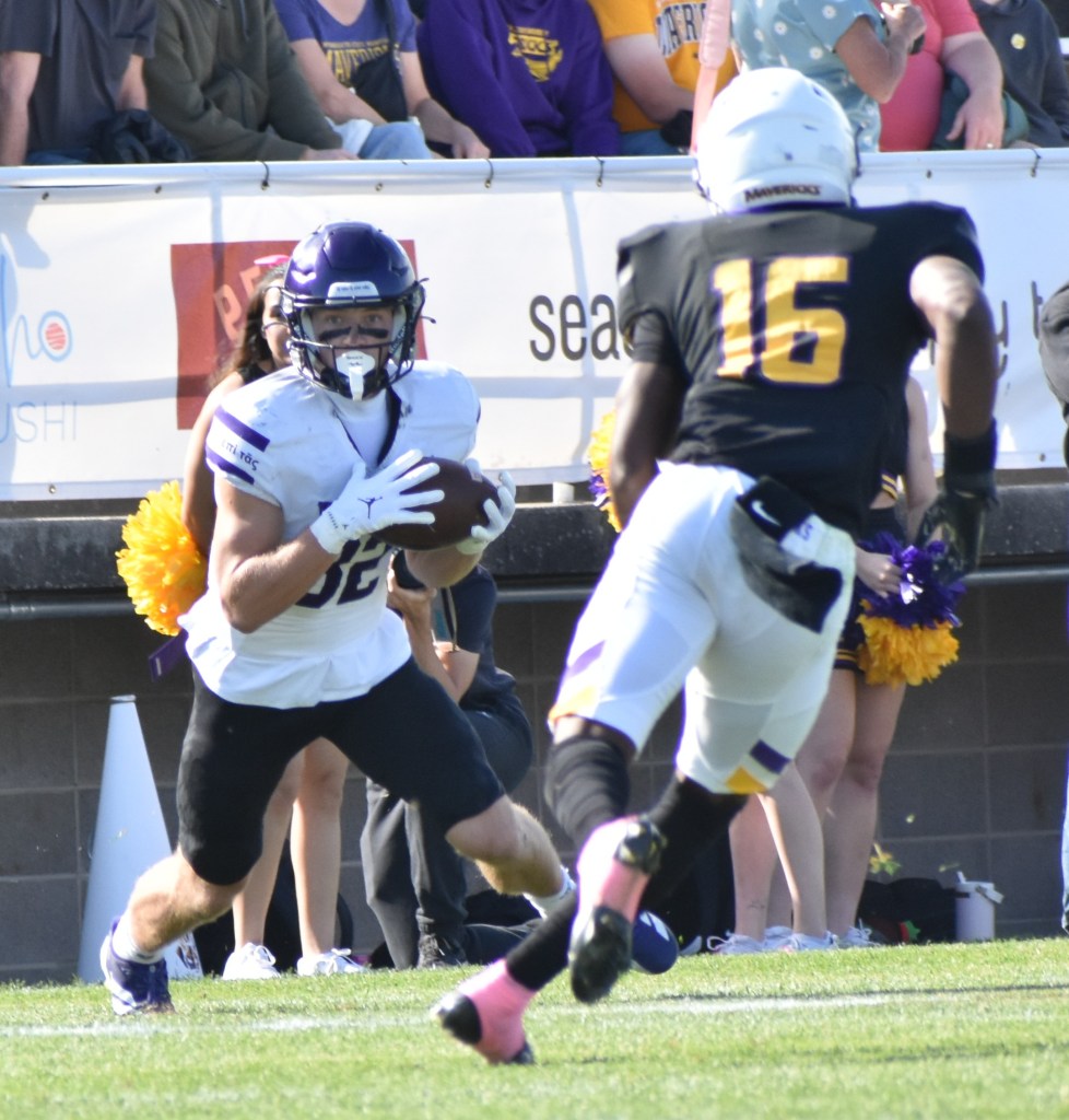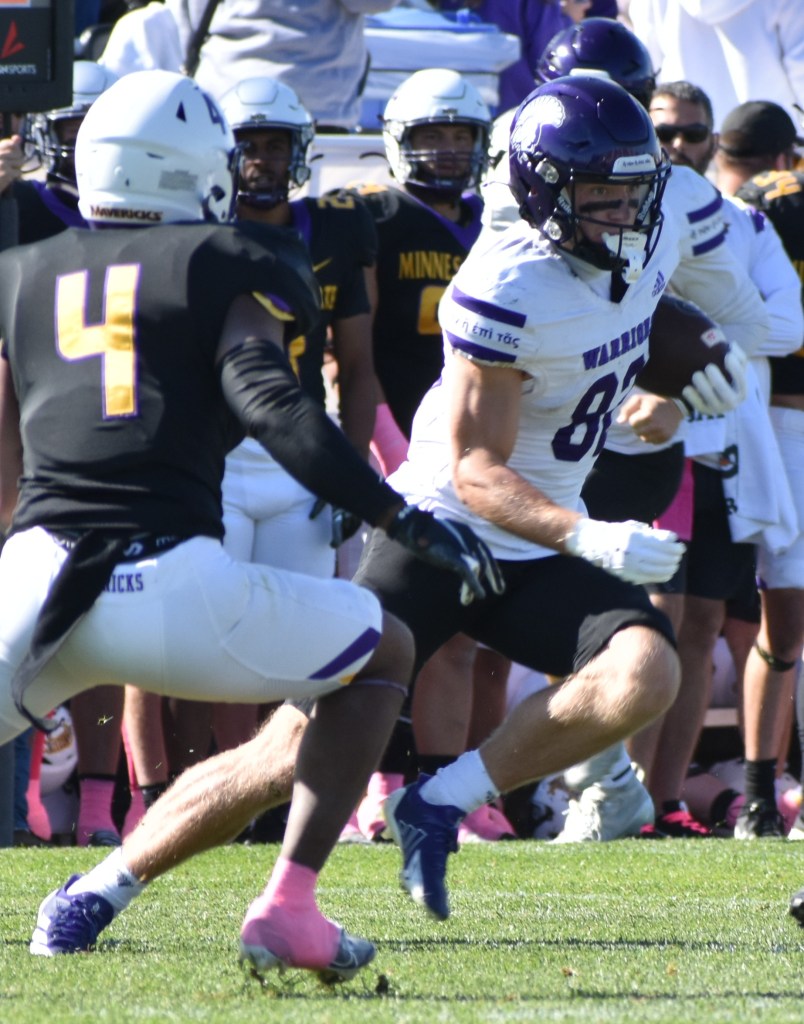 Nolan Ginskey finished with 6 catches for 68 yards and one touchdown against No. 14-ranked Minnesota State University on Saturday, Oct. 11. The Mavericks beat the Warriors, 47-21 at Blakeslee Stadium in Mankato.