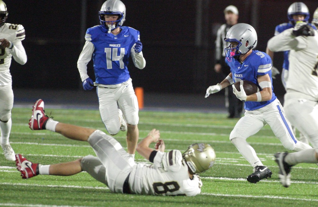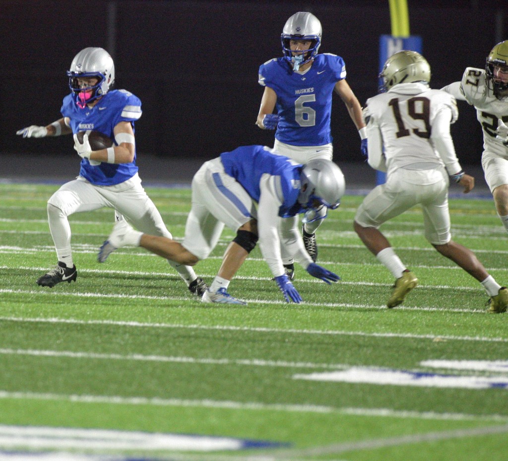 Owatonna finally countered in the final few minutes of the first half, taking over on downs just beyond midfield and feeding its star tailback until Graham found an opening on the right side of the line and busted loose into the end zone for a game-tying 20-yard touchdown with 1 minute, 17 seconds remaining before the break. Landen Sturges’ extra point was true and the Huskies would eventually take a 7-6 lead into halftime.